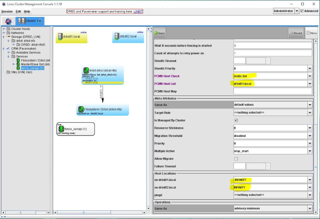 - on drbd02.local = Hier soll der Fence Agent immer laufen. Deswegen INFINITY Damit drbd01.local neu gestartet werden kann.
